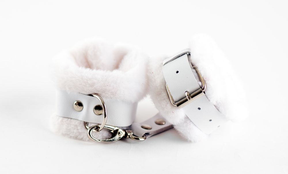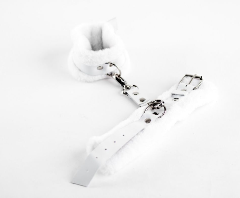 Белые кожаные наручники с нежным мехом