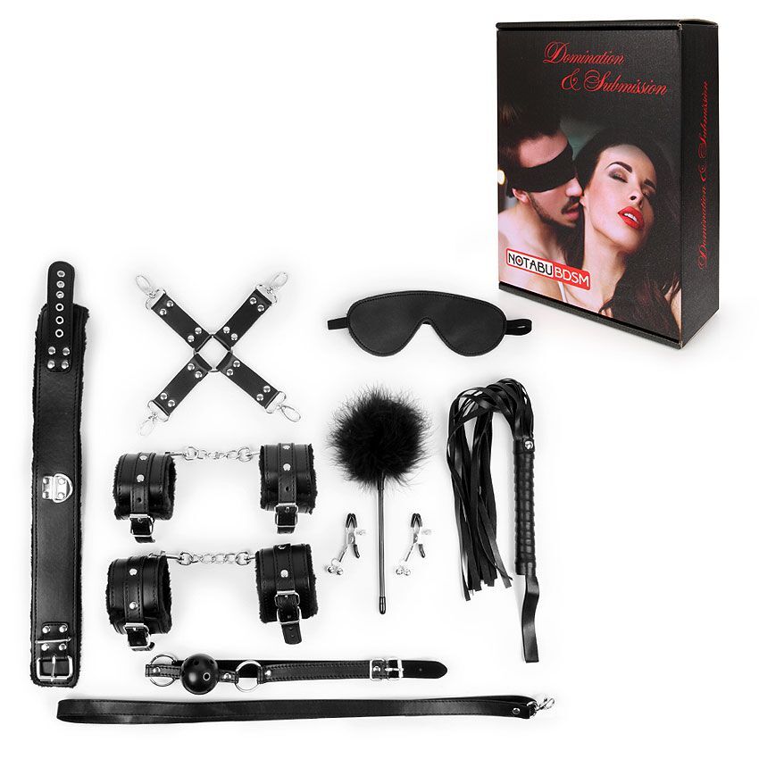 Большой набор БДСМ в черном цвете: маска, кляп, зажимы, плётка, ошейник, наручники, оковы, щекоталка, фиксатор