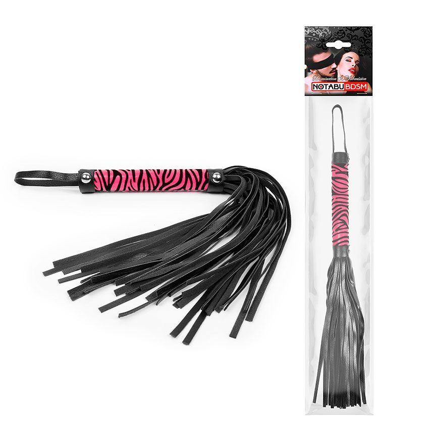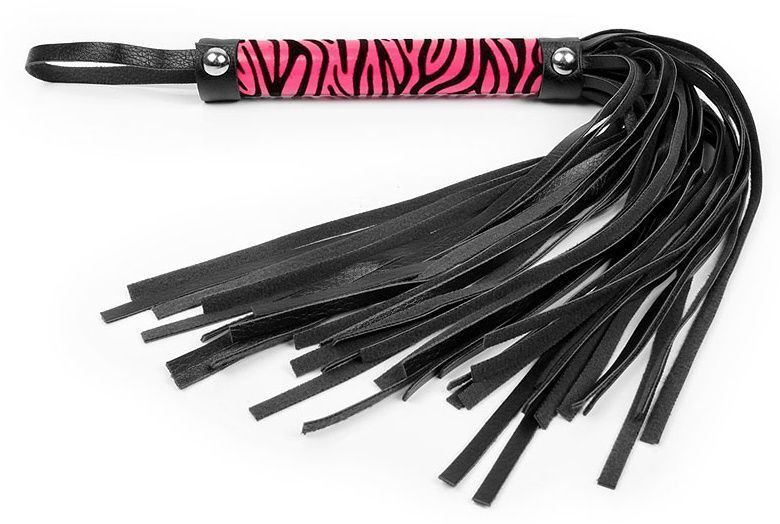 Черная многохвостовая плеть с круглой розовой ручкой-зеброй - 39 см.