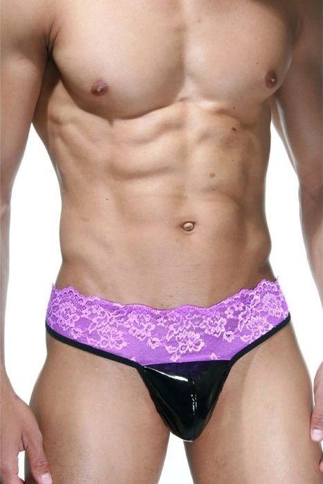 Черно-фиолетовые трусы-танга на кружевном поясе
