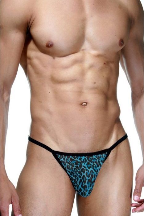 Черно-голубые трусы-стринги с леопардовым принтом