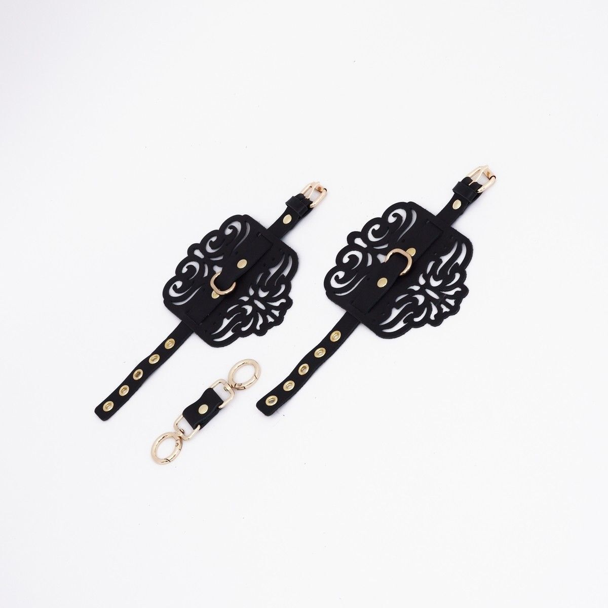 Черные фигурные наручники с золотистой фурнитурой