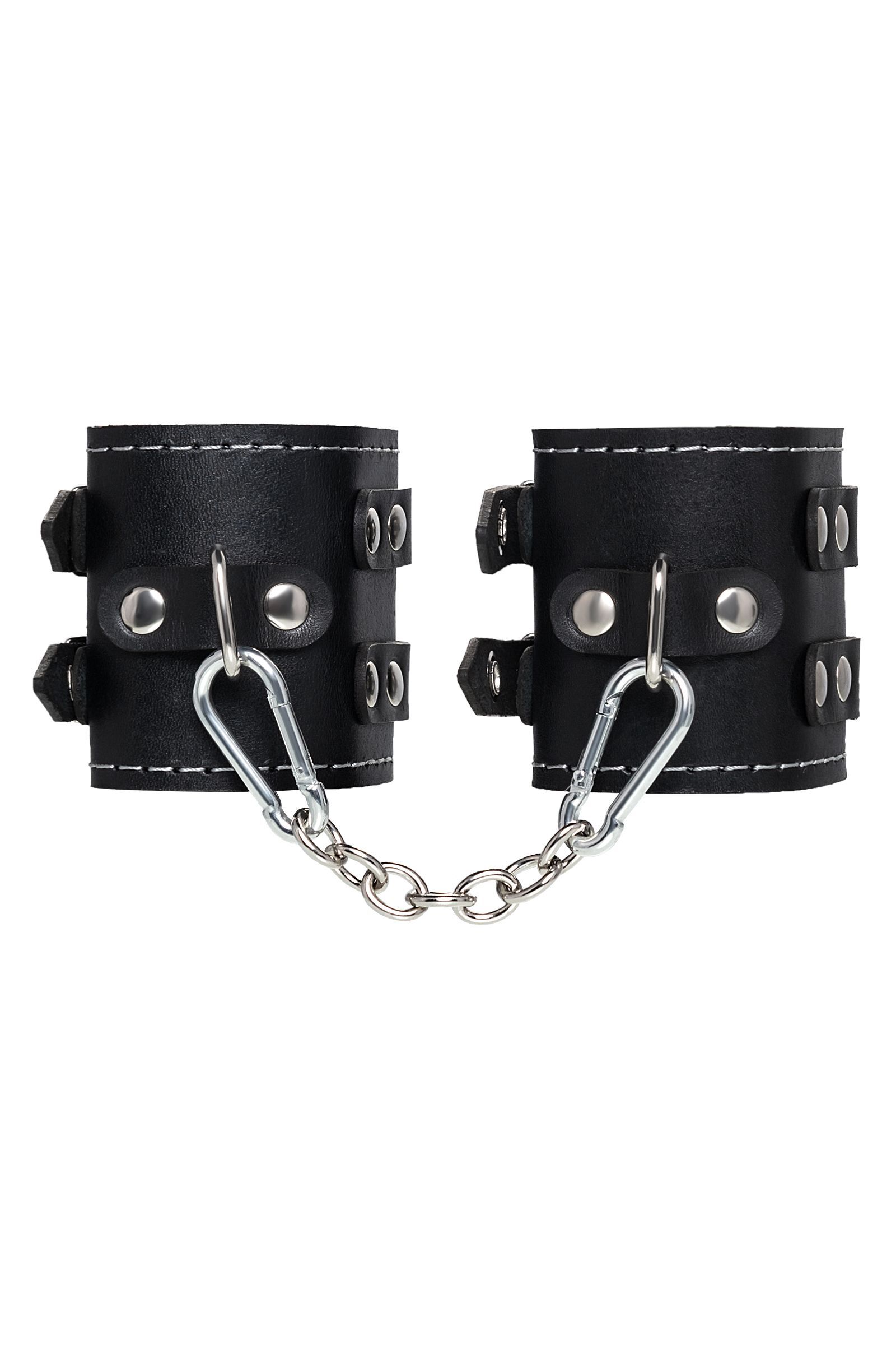 Черные кожаные наручники с двумя ремнями и красной подкладкой