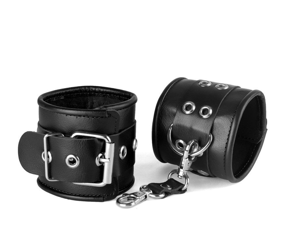Черные кожаные наручники с ремешком с двумя карабинами на концах