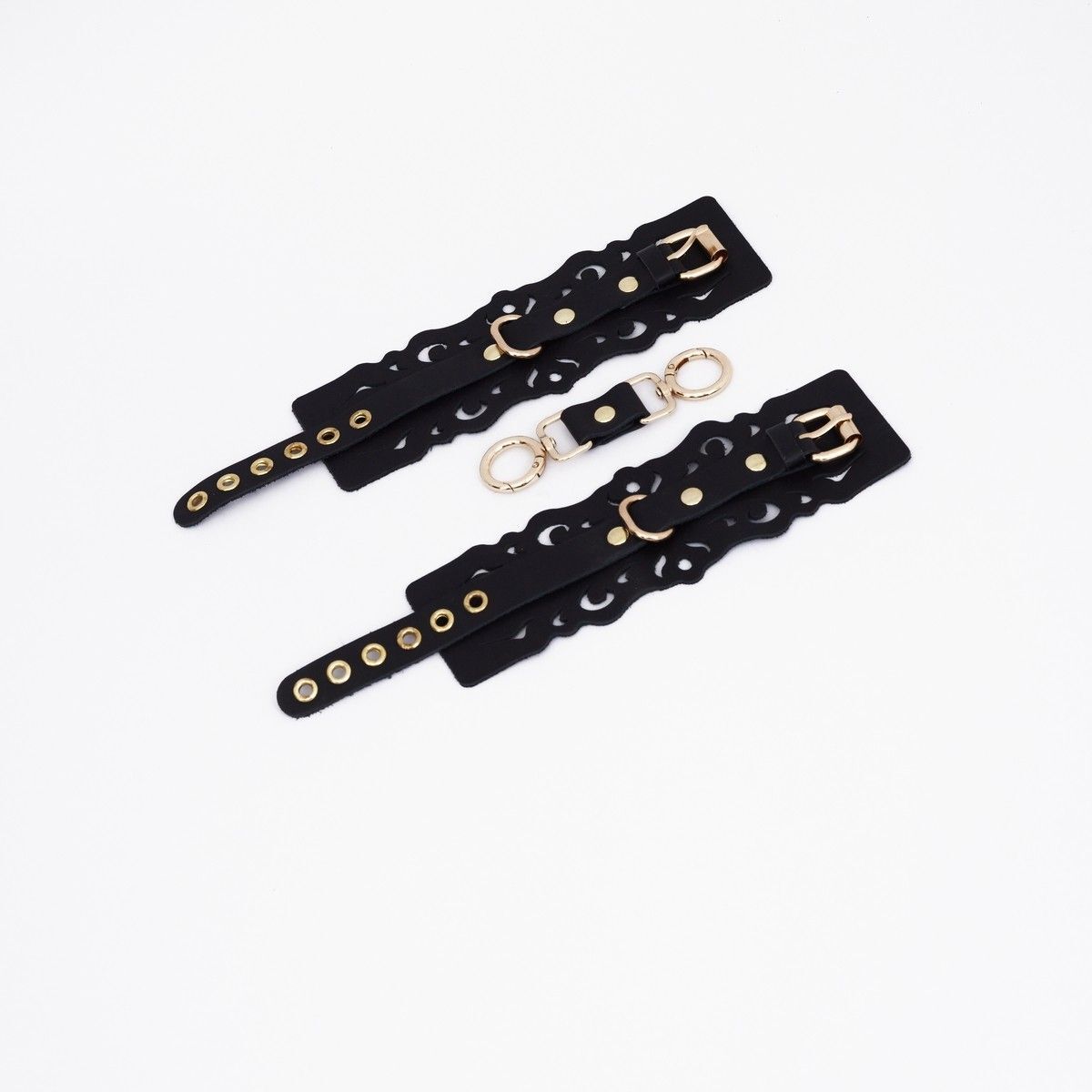Черные кожаные наручники с узорами и золотистой фурнитурой