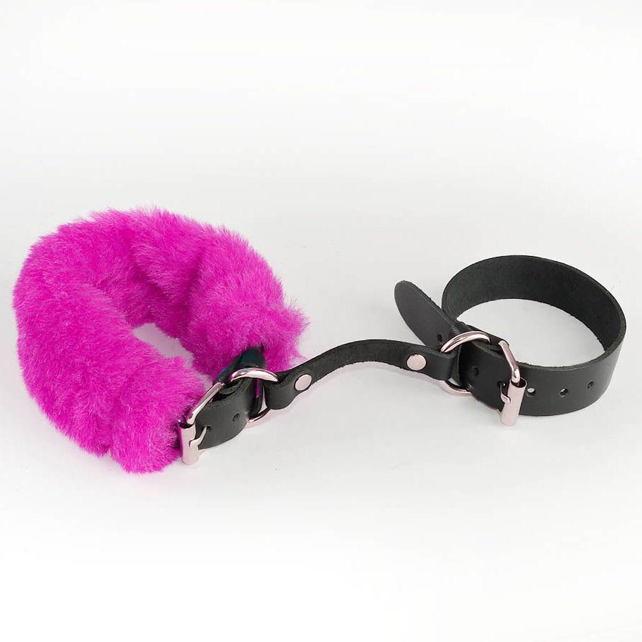 Черные кожаные наручники со съемной ярко-розовой опушкой