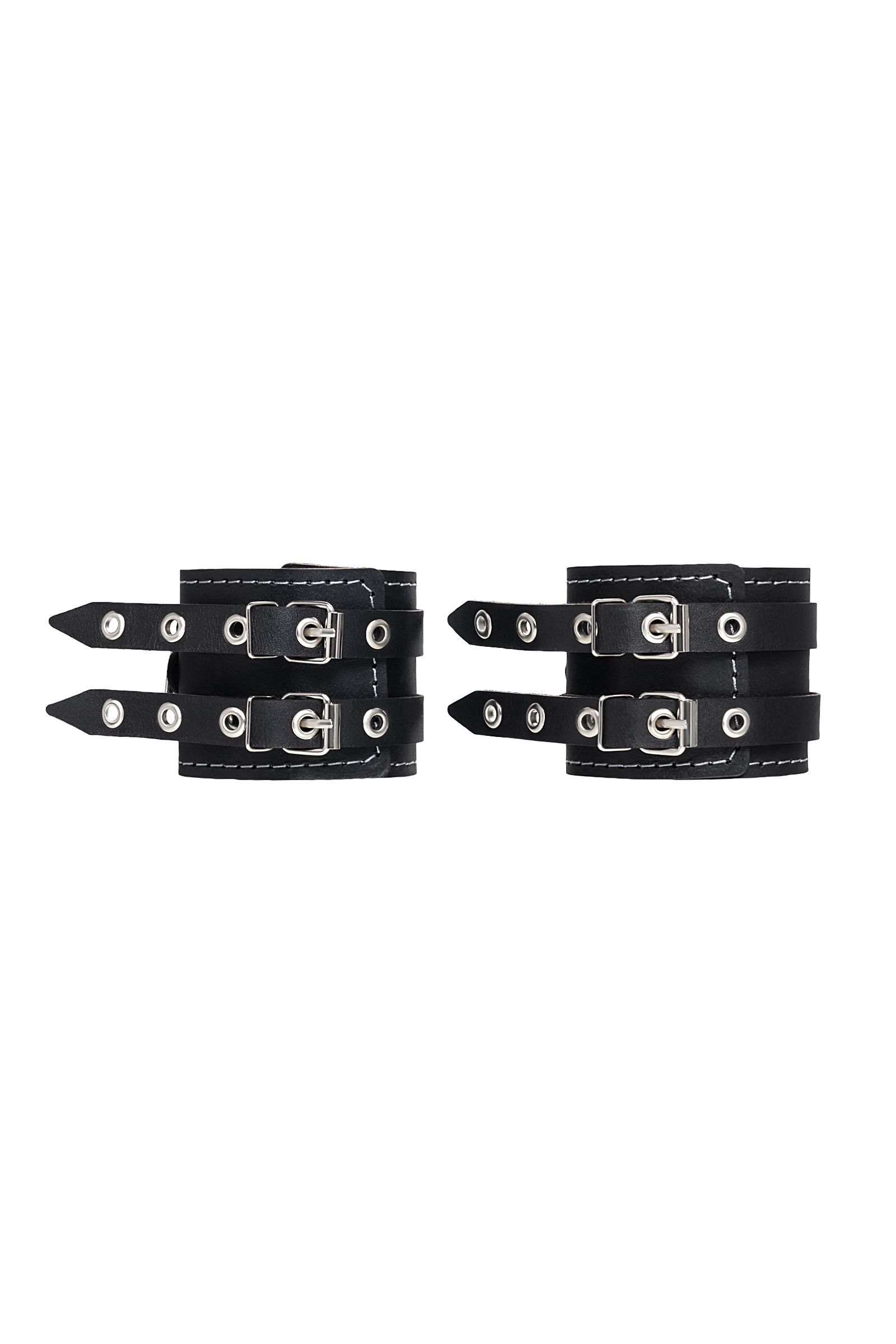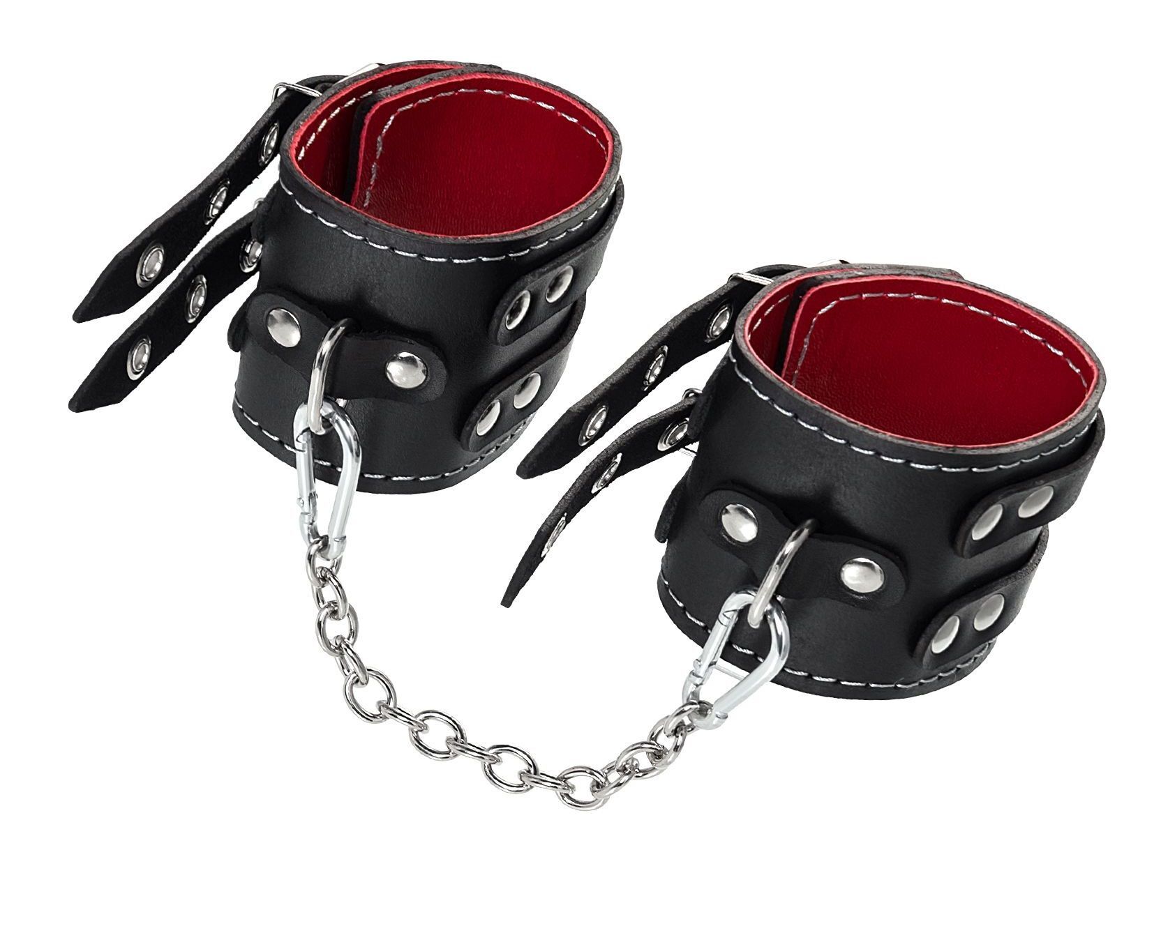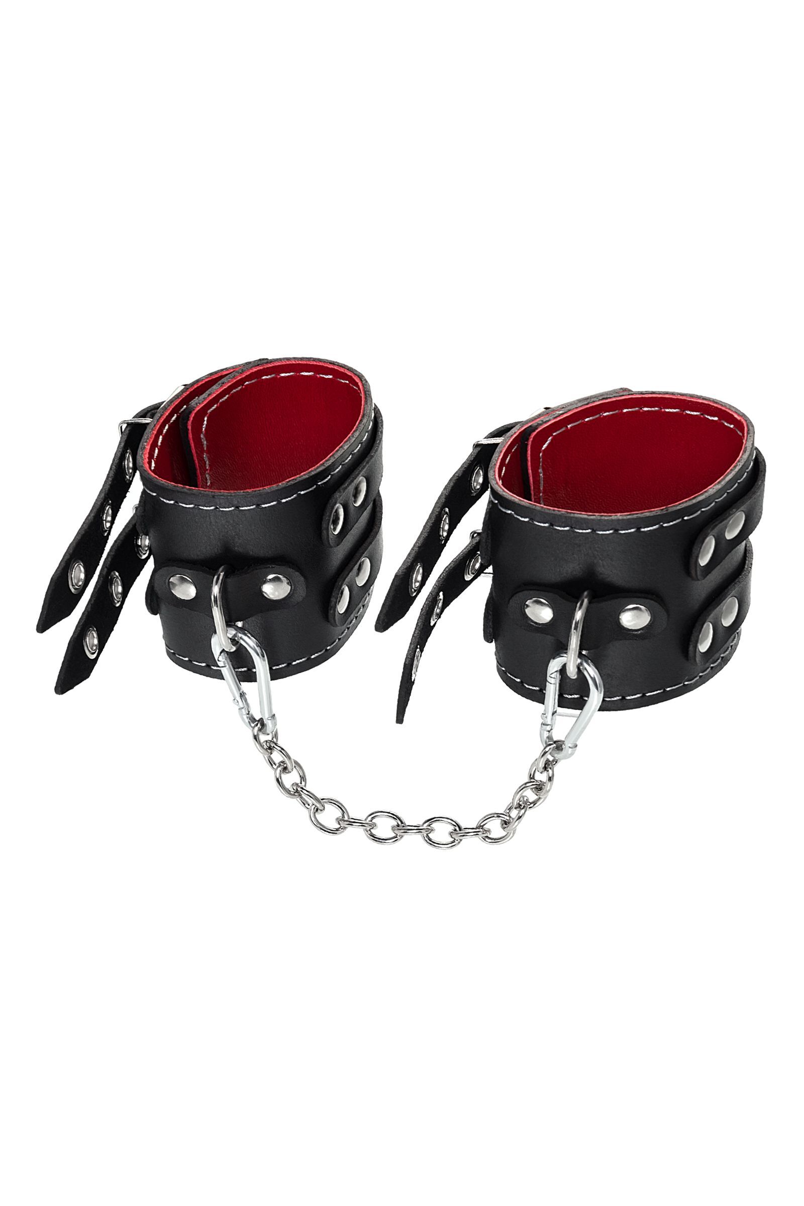 Черные кожаные оковы с двумя ремнями и красной подкладкой