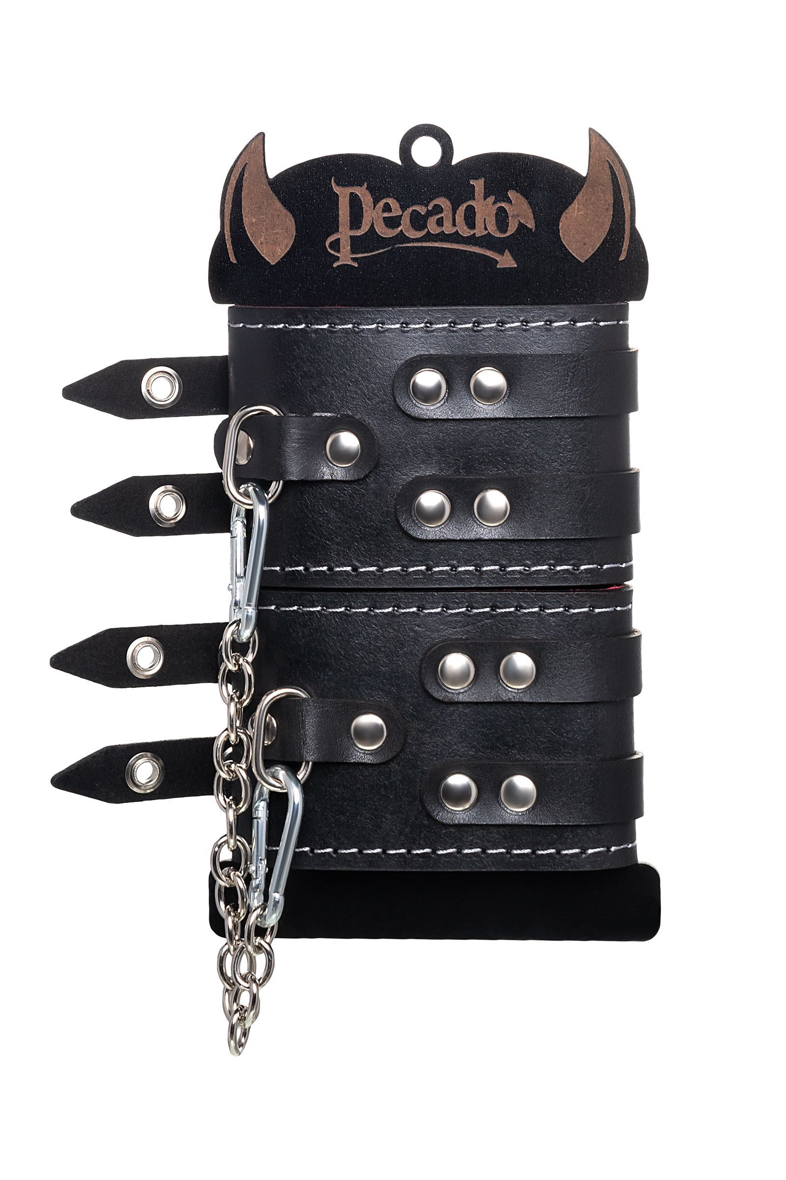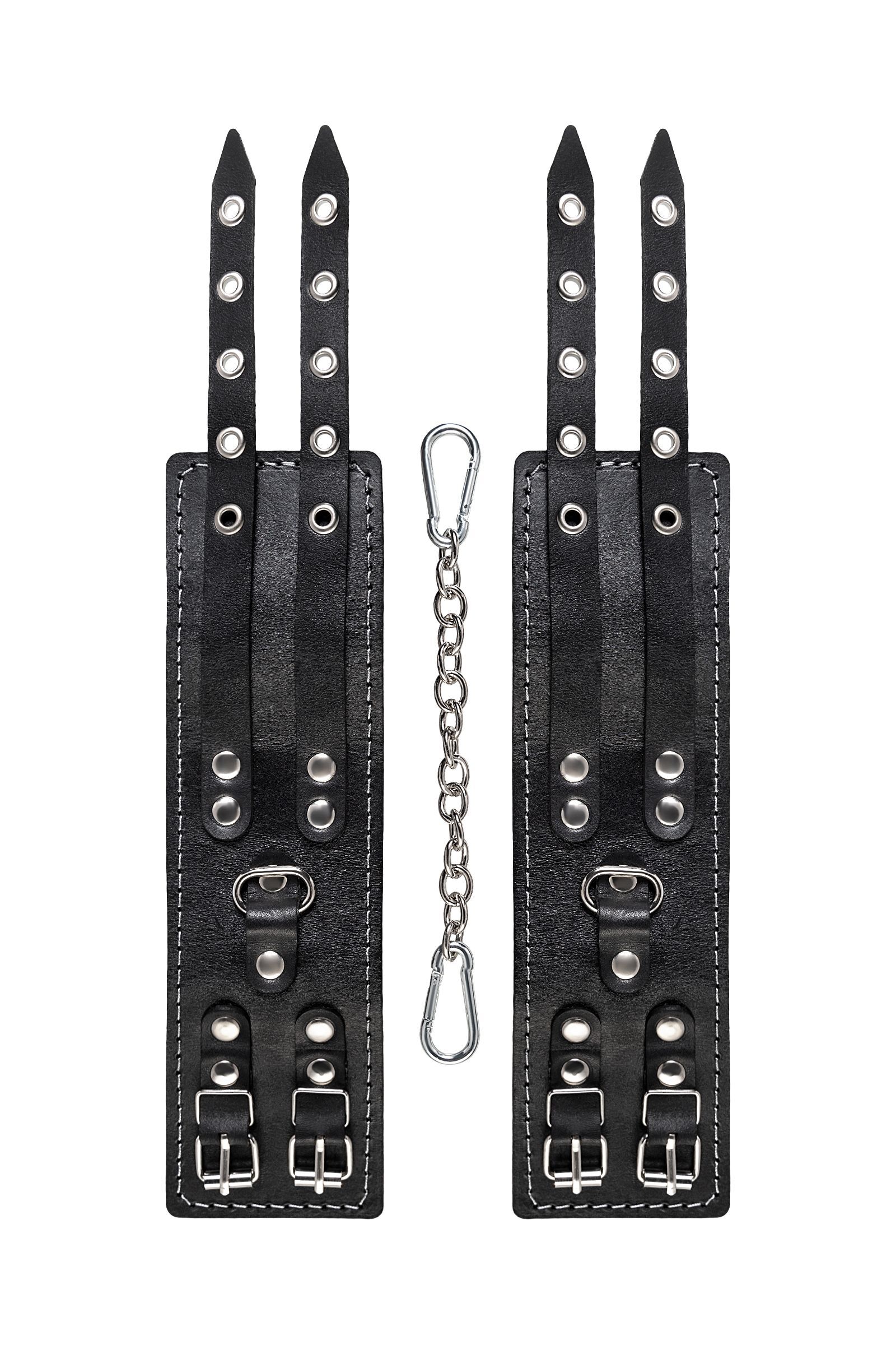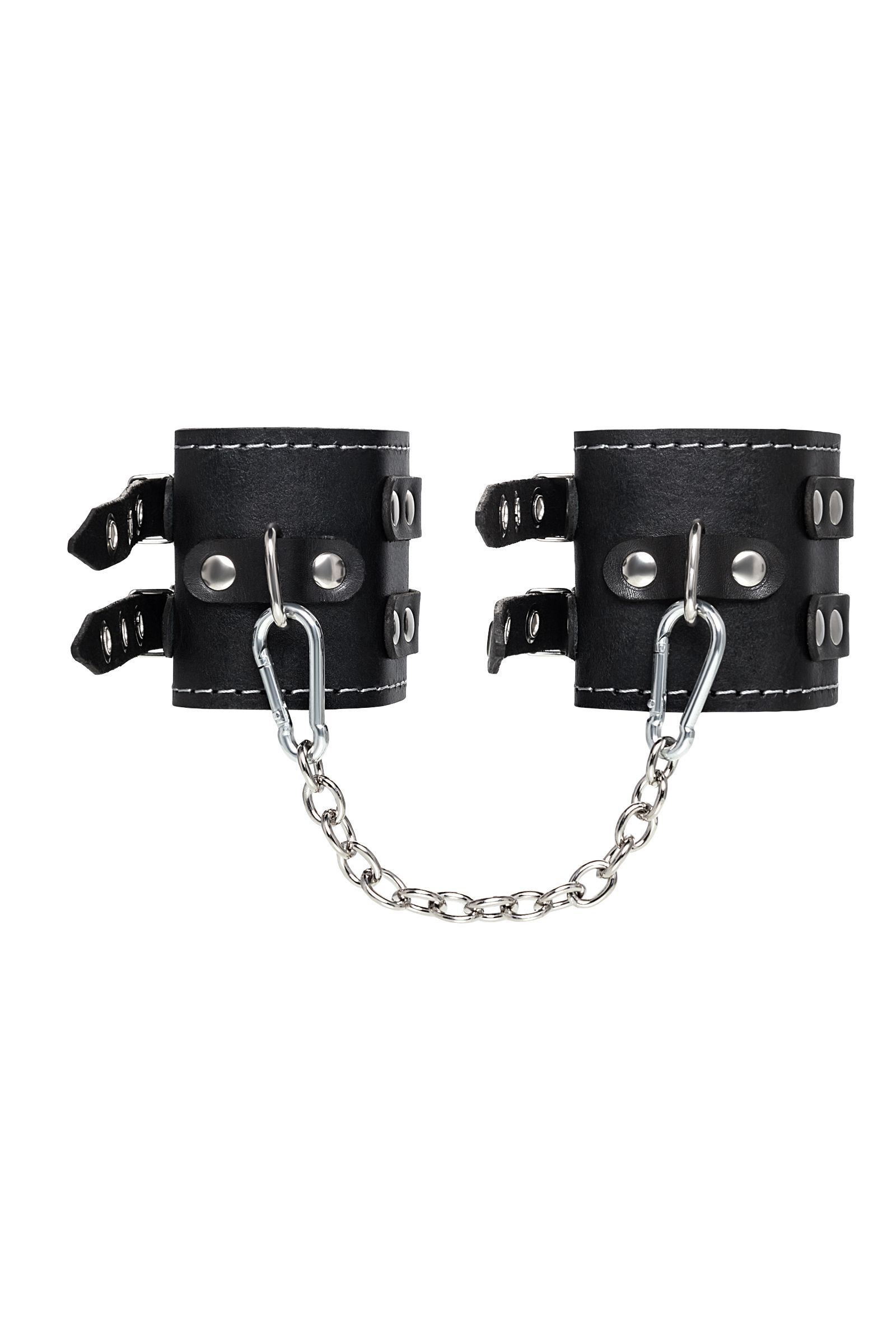 Черные кожаные оковы с двумя ремнями и красной подкладкой