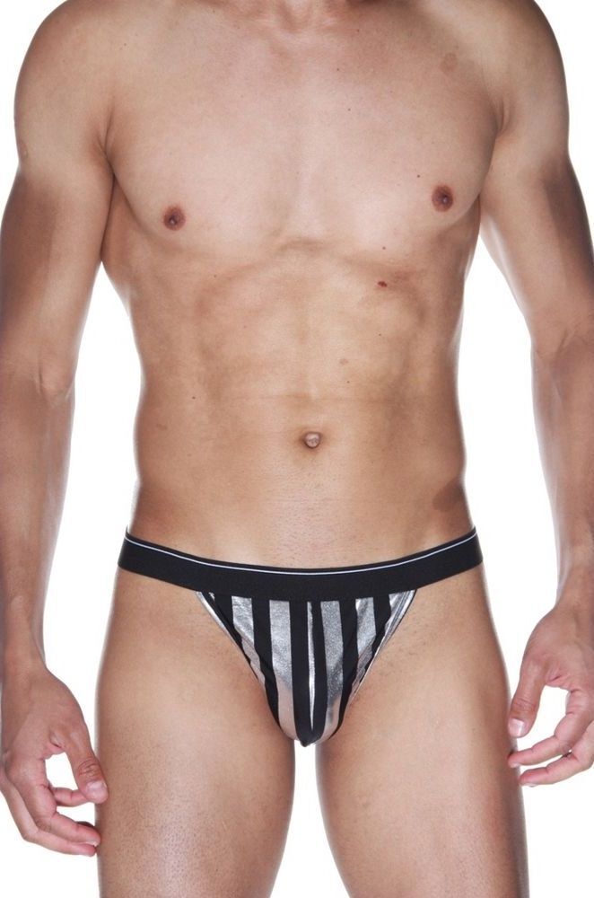Черные мужские трусы-тонги в серебристую полоску
