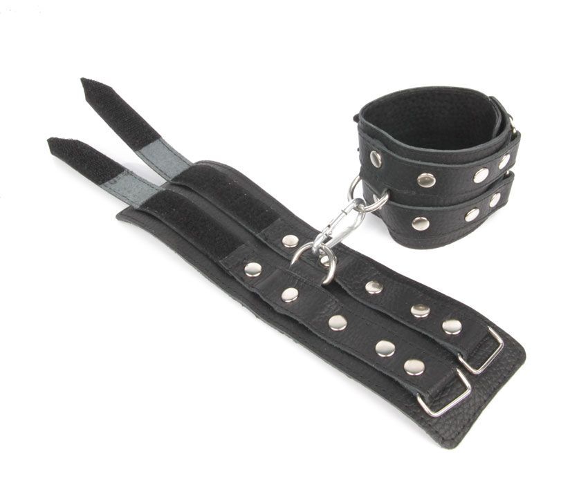 Черные широкие кожаные наручники с заклепками на карабине