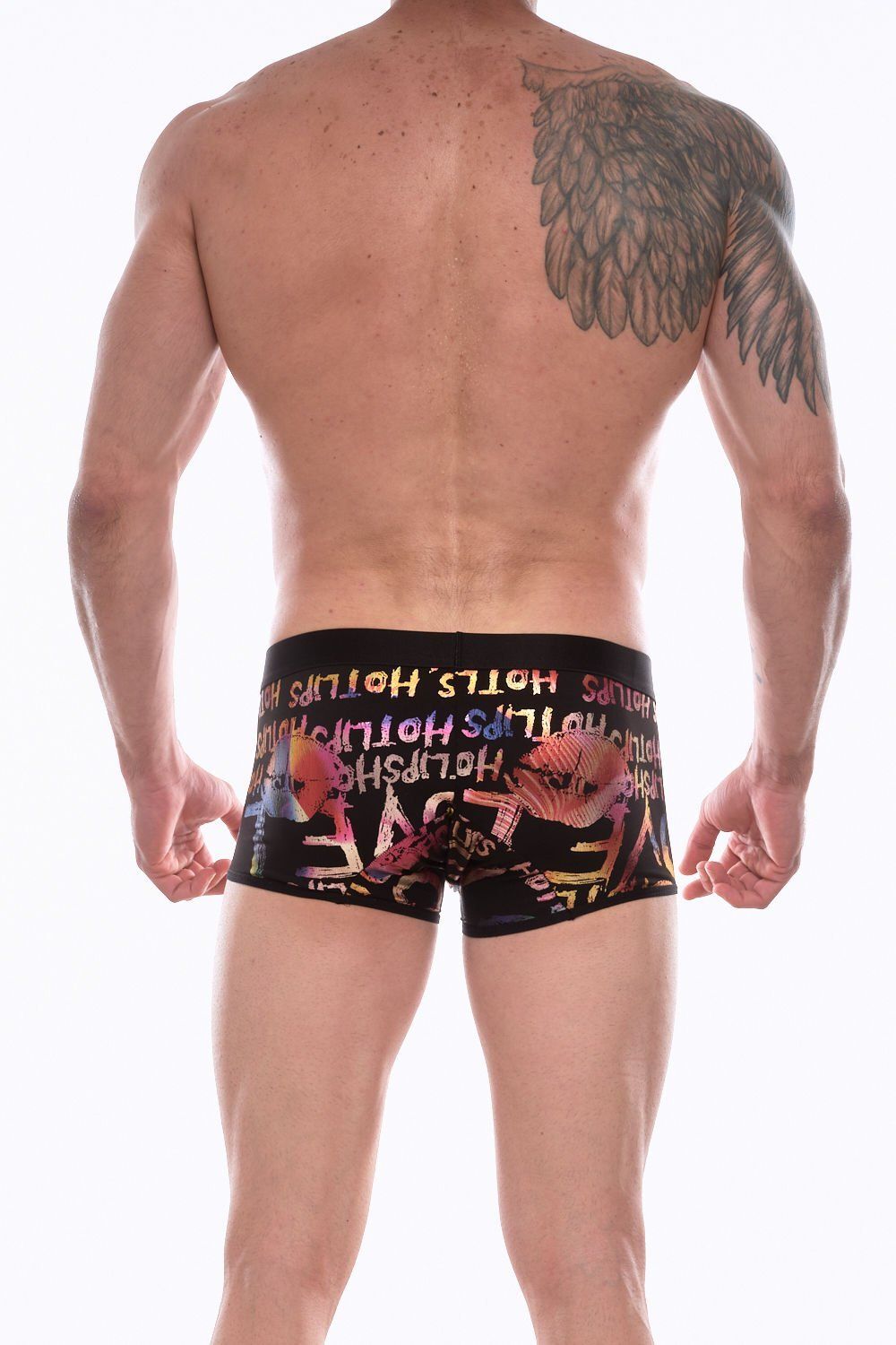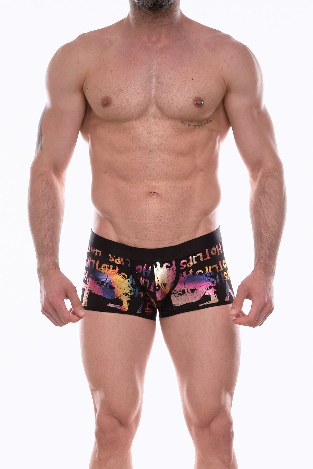 Черные трусы-боксеры с разноцветным принтом в виде надписей и губ