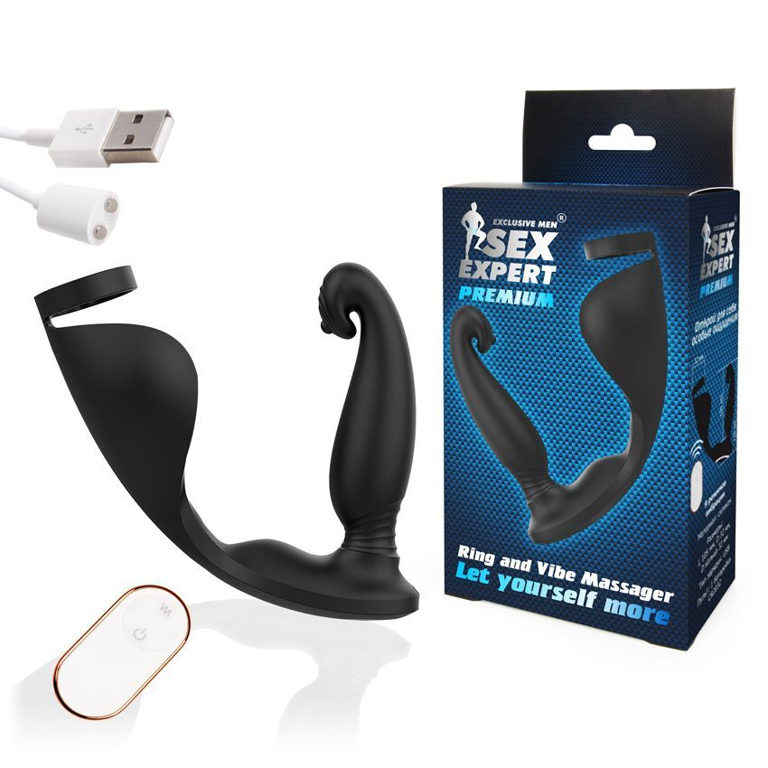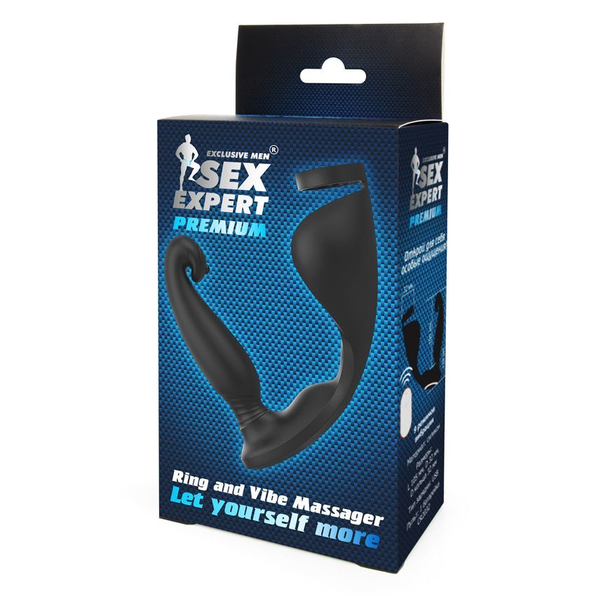 Черный анальный вибромассажёр с эрекционным кольцом и подхватом для мошонки - 12,8 см.