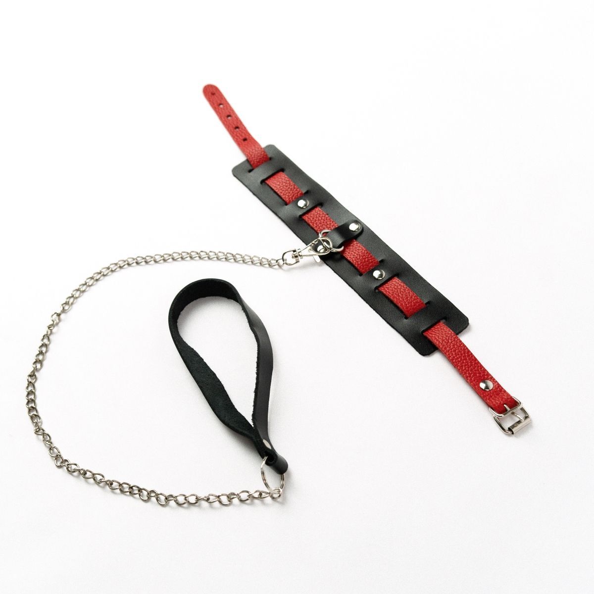 Черный ошейник с красным ремешком и поводком