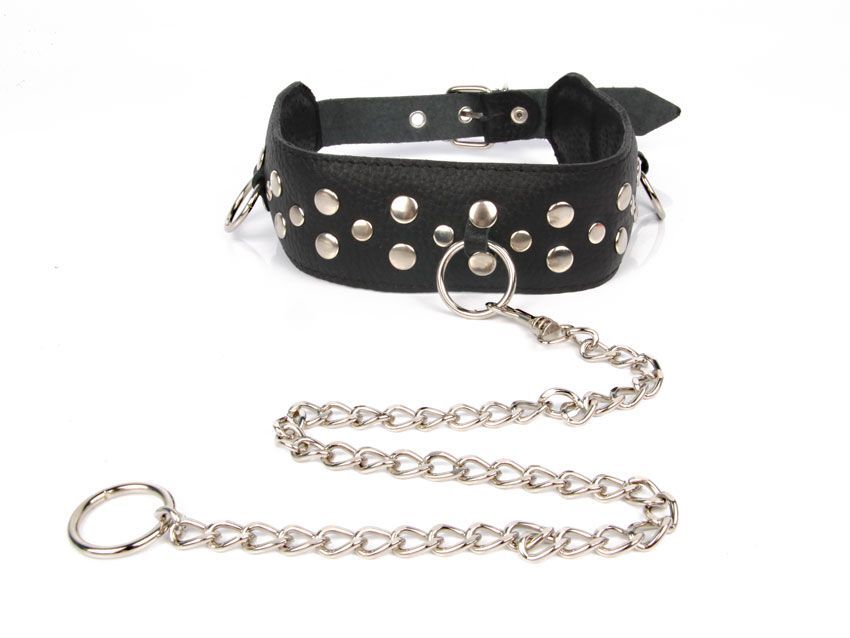 Черный ошейник с заклепками с металлическим поводком-цепочкой
