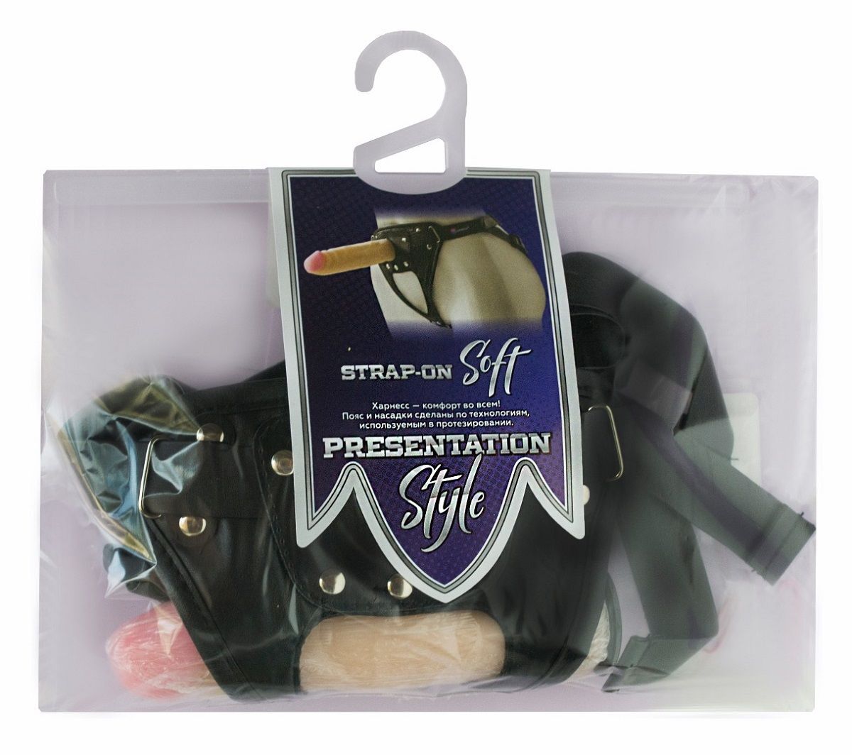 Черный пояс-трусики с двумя телесными насадками Soft-Dolli - 15,7 и 10 см.