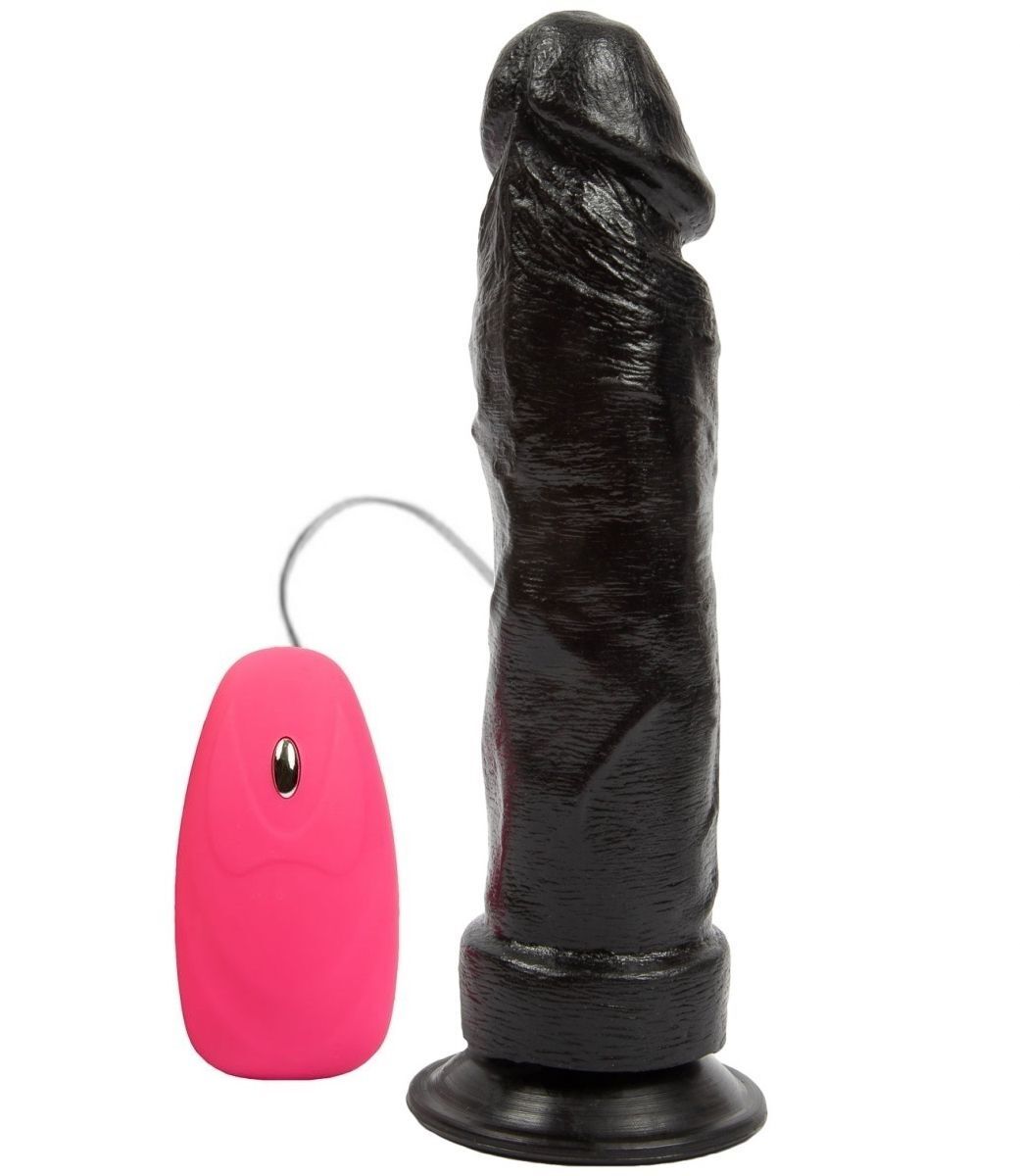 Черный вибромассажер на присоске с проводным пультом - 20,5 см.