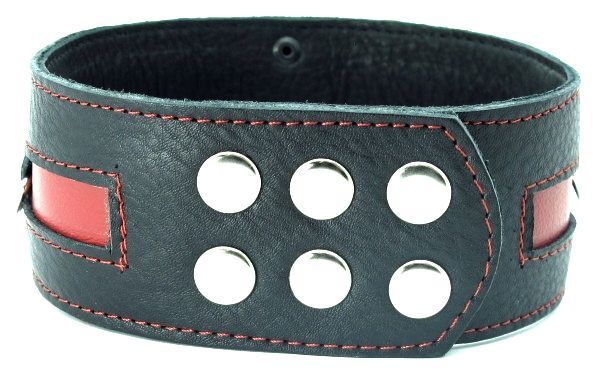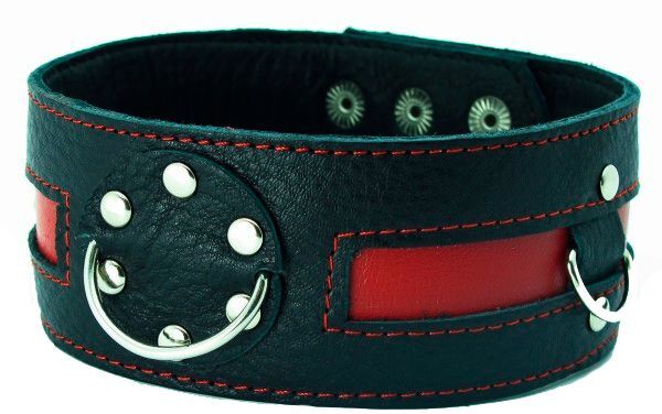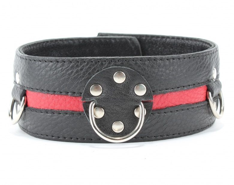 Чёрный кожаный ошейник с красной полосой и кольцами