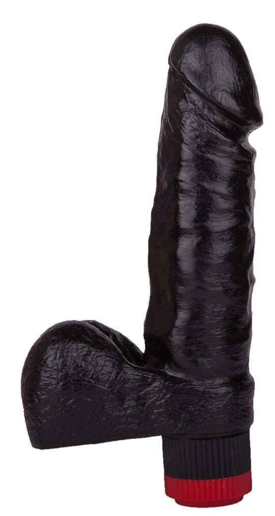 Чёрный виброфаллос с пышной мошонкой - 16 см.