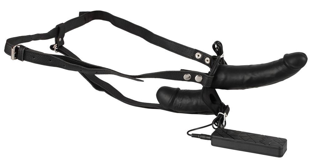 Чёрный вибрострапон с вагинальной пробкой Double Thruster - 17 см.