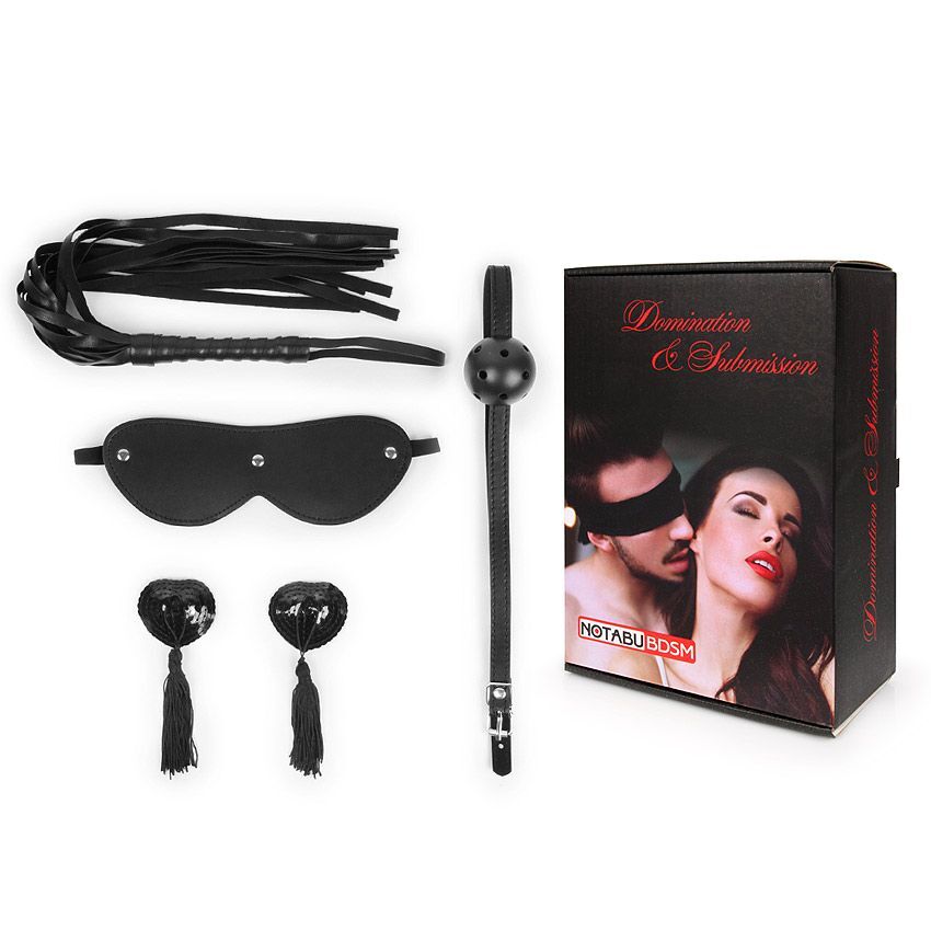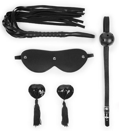 Эротический набор в черном цвете: маска, кляп, пэстисы, плётка