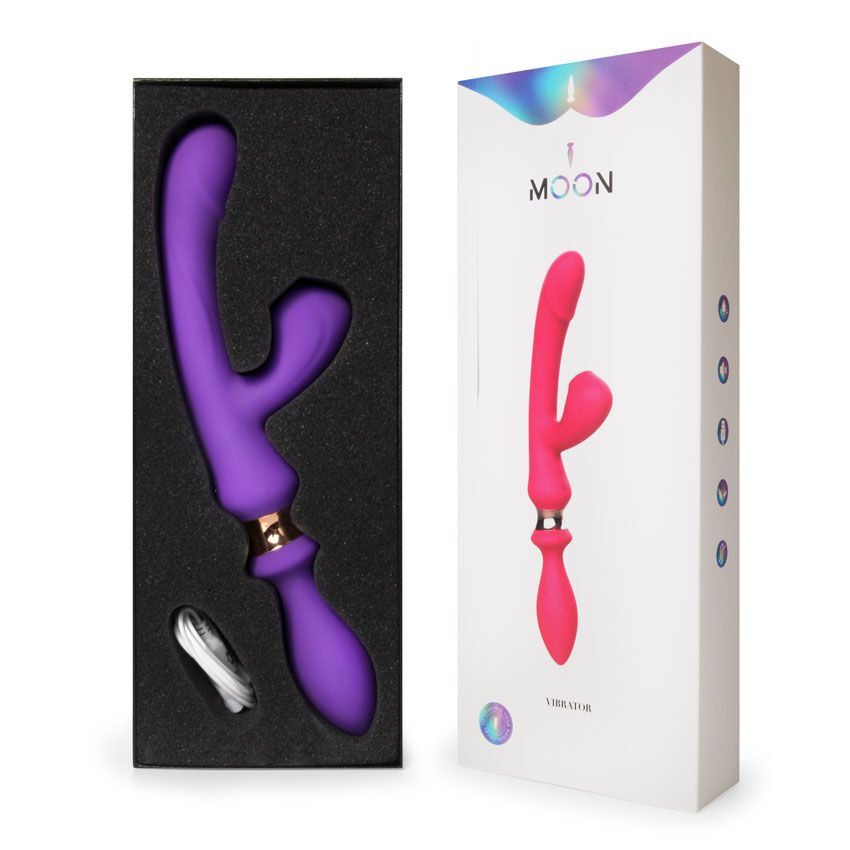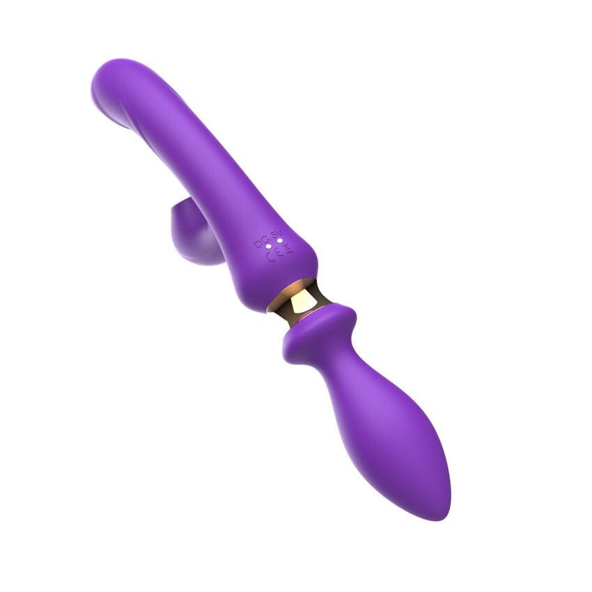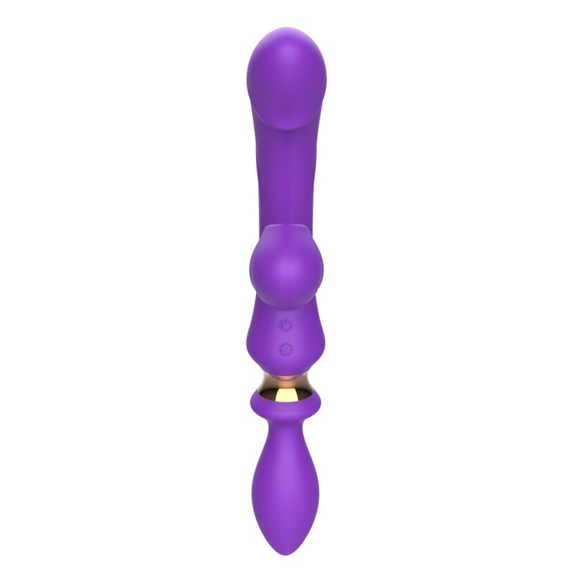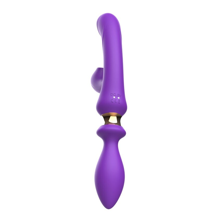 Фиолетовый двусторонний вибромассажёр с клиторальным отростком - 30 см.
