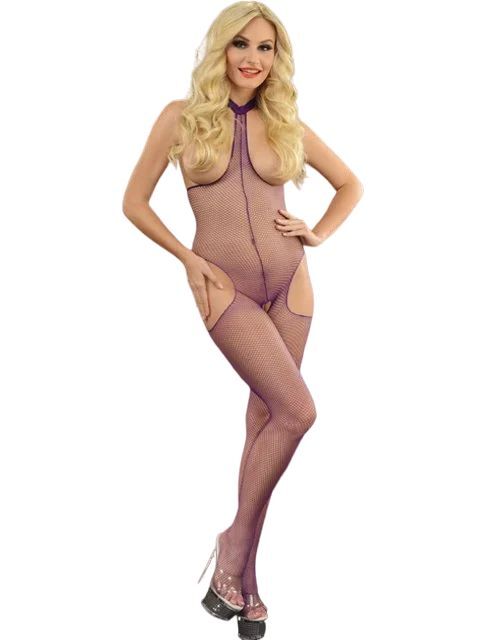 Фиолетовый кэтсьюит с вырезами на груди, бёдрах и в шагу