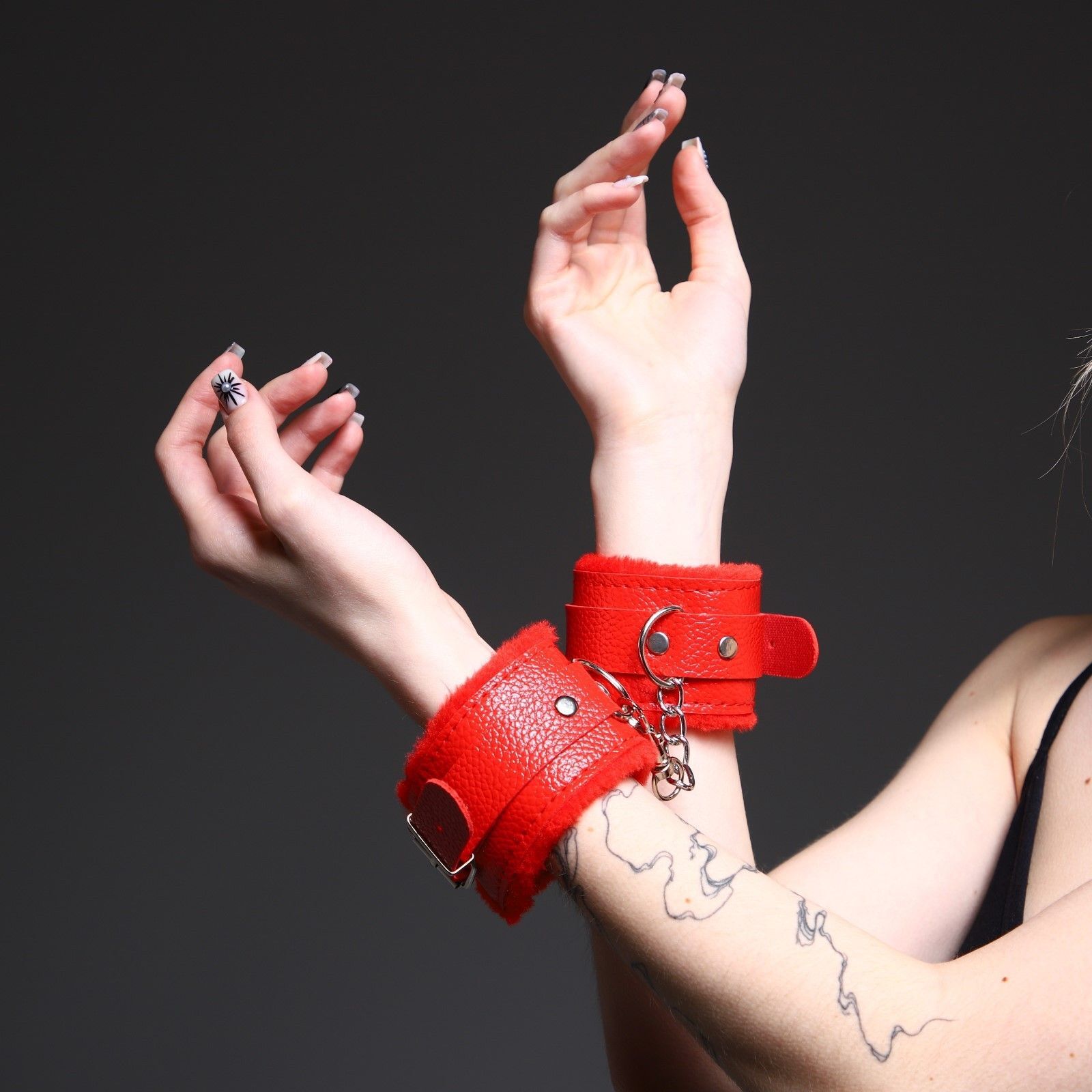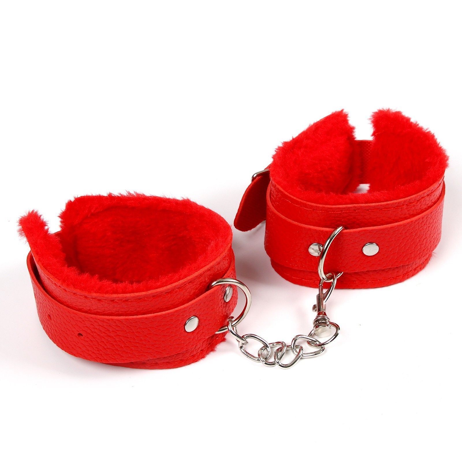 Красные наручники с меховой подкладкой и ремешками
