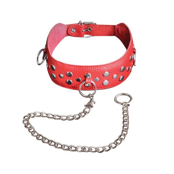 Красный кожаный ошейник с карабином и поводком