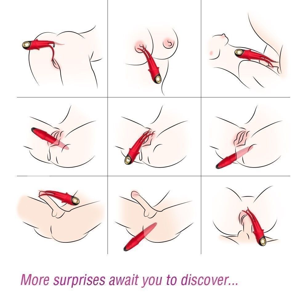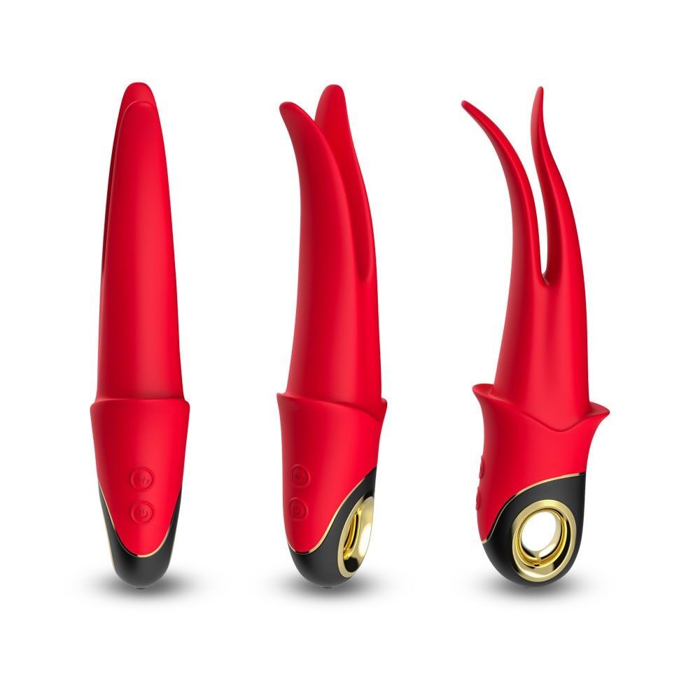 Красный стимулятор эрогенных зон с раздвоенным концом - 23,5 см.