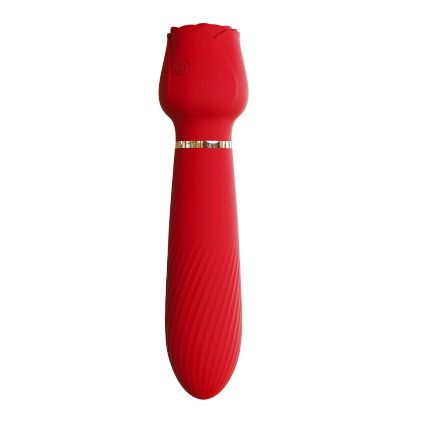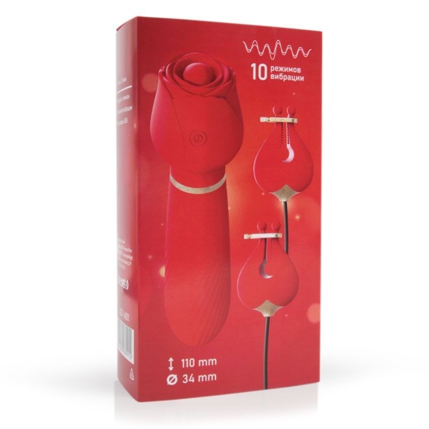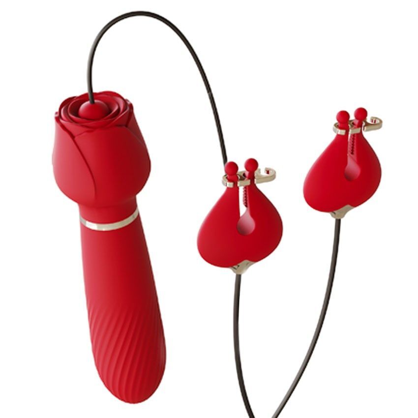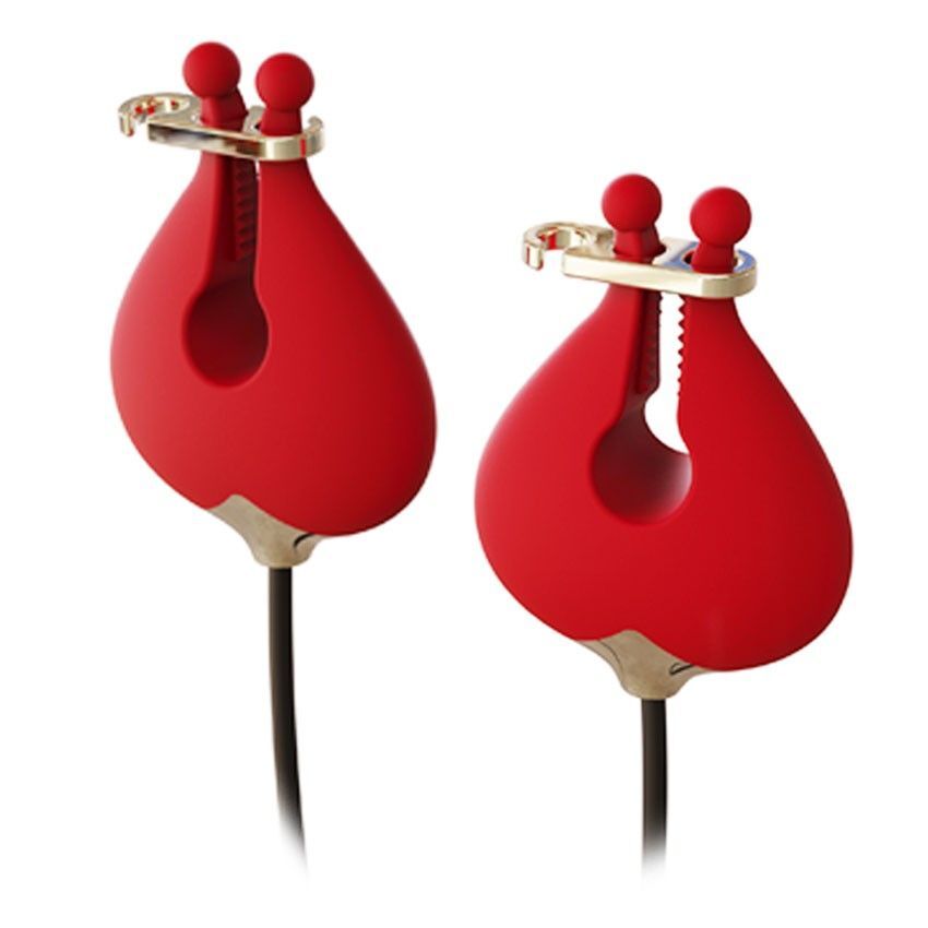 Красный вибромассажёр с зажимами для сосков - 16 см.