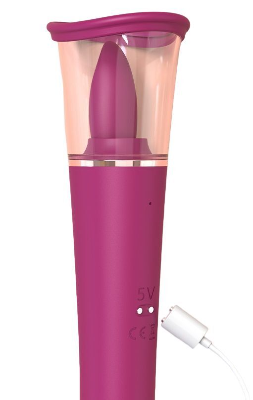 Малиновый двусторонний вибратор с вакуумной помпой и подвижным язычком - 26,7 см.