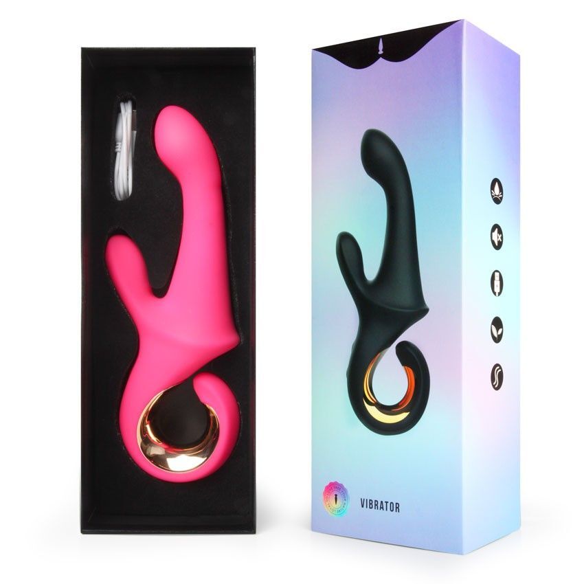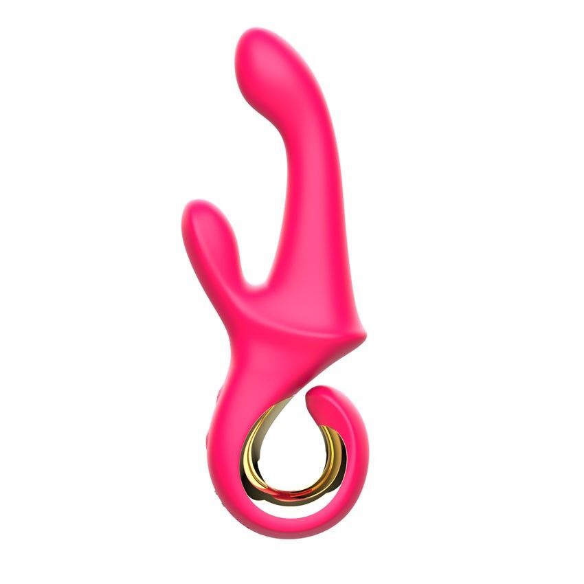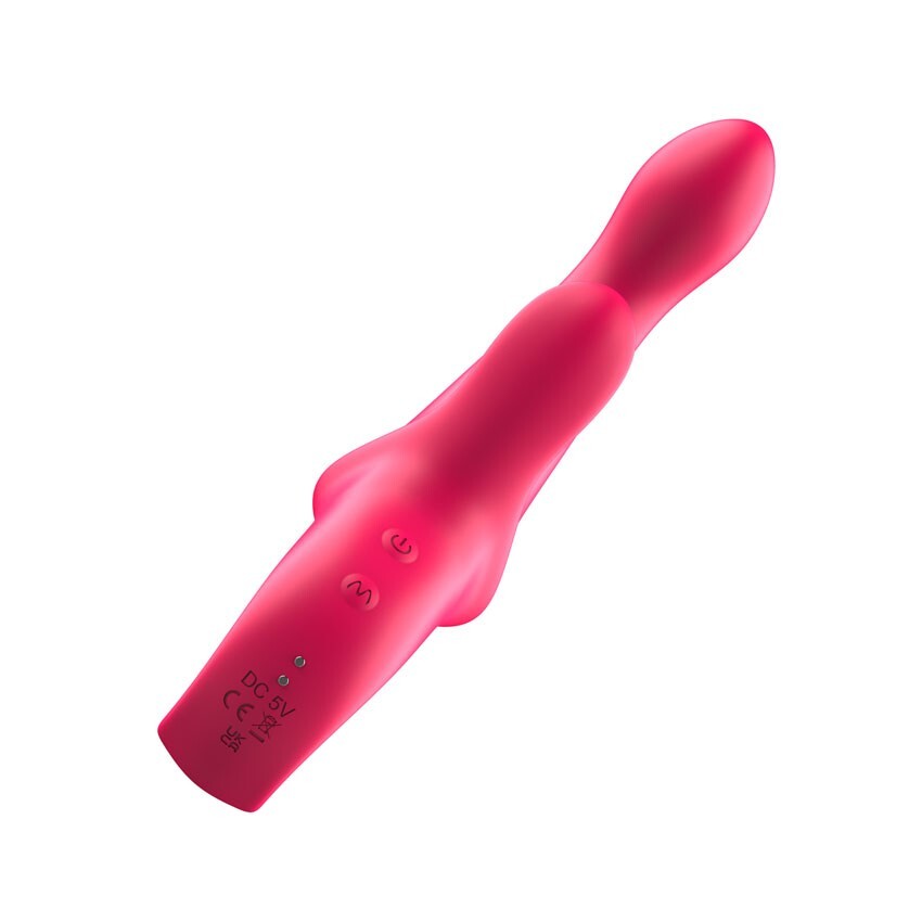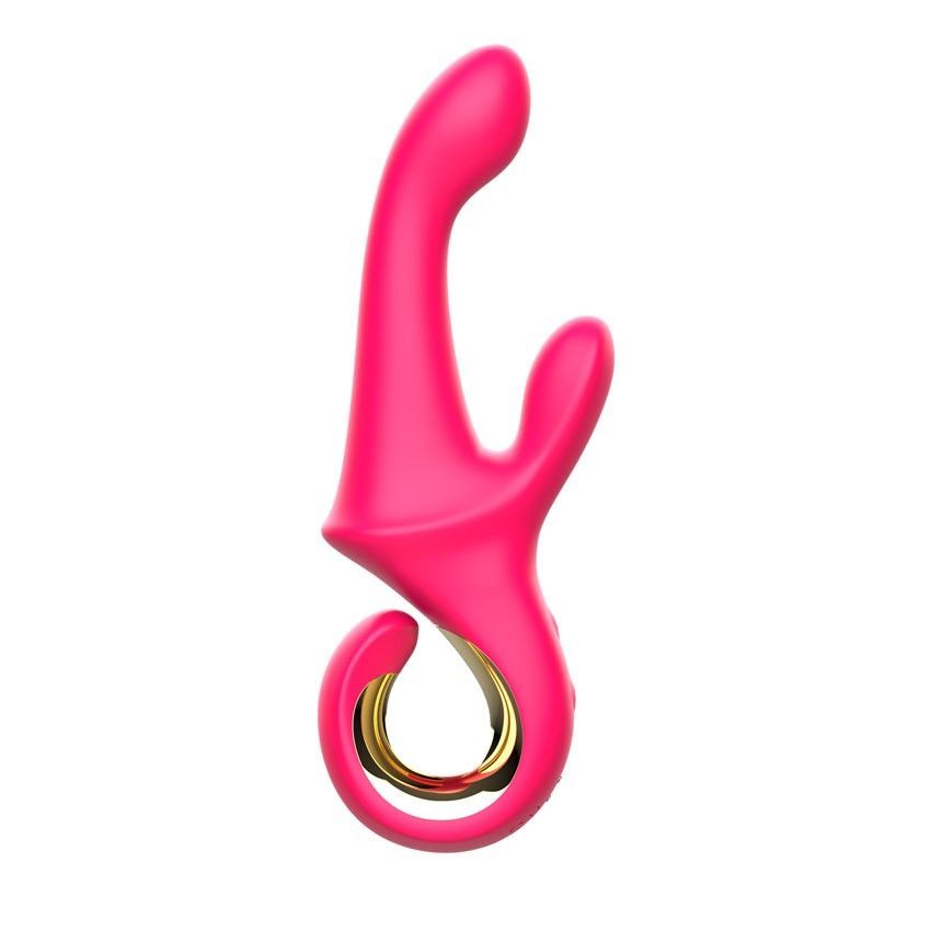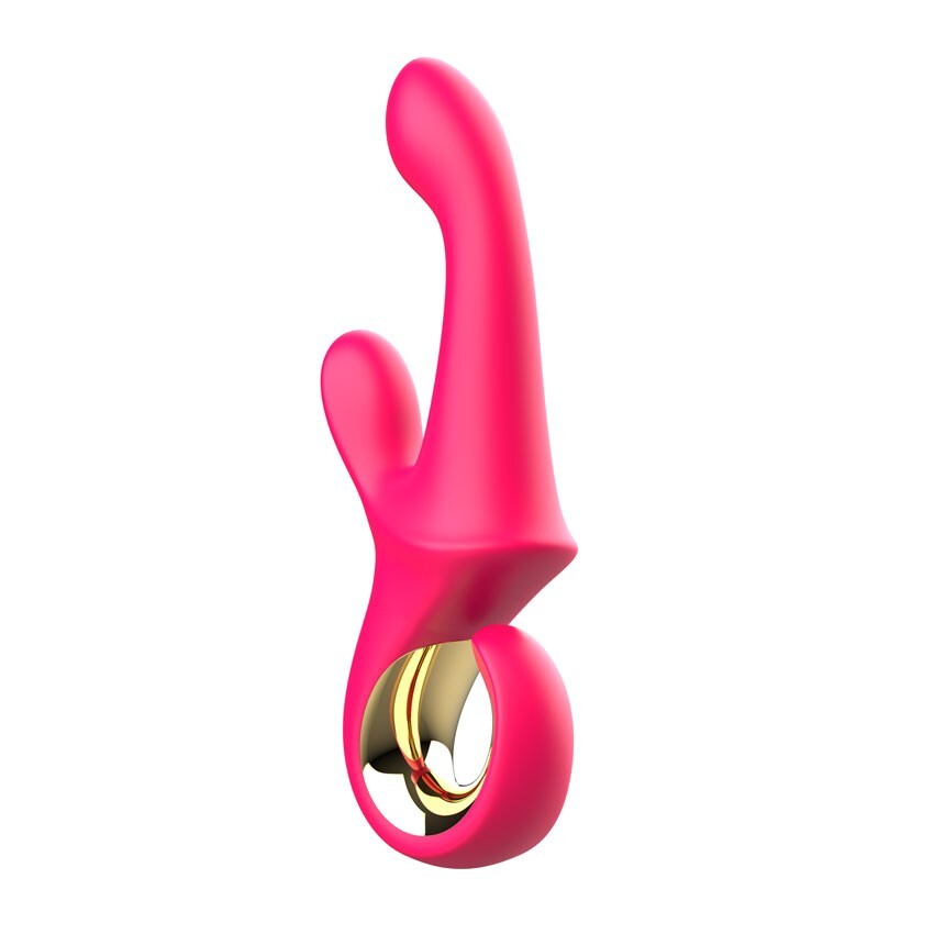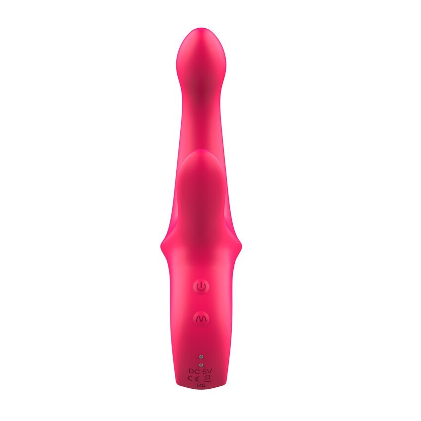 Розовый вибратор со стимулятором клитора и ручкой-кольцом - 22,6 см.