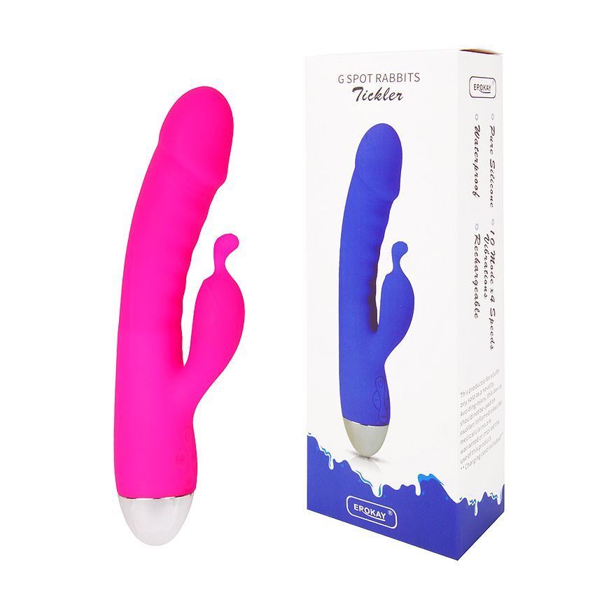 Розовый вибромассажер с отростком для стимуляции клитора - 22 см.