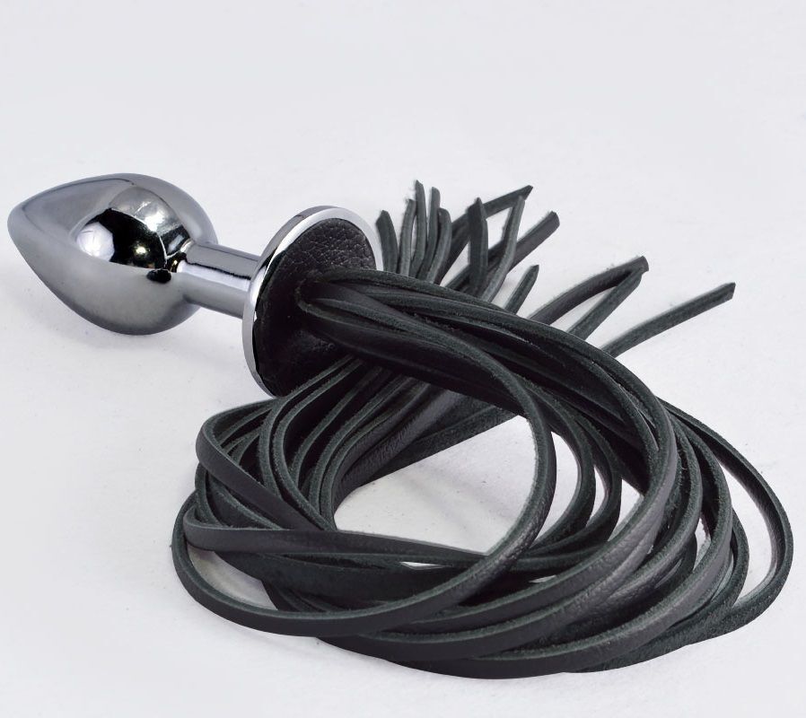 Серебристая анальная пробка с черной плетью