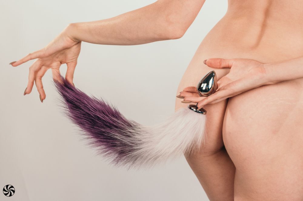 Серебристая анальная пробка с фиолетовым хвостом Galaxy