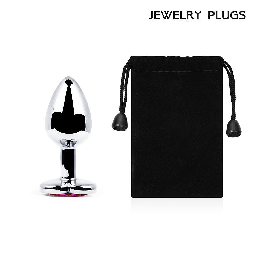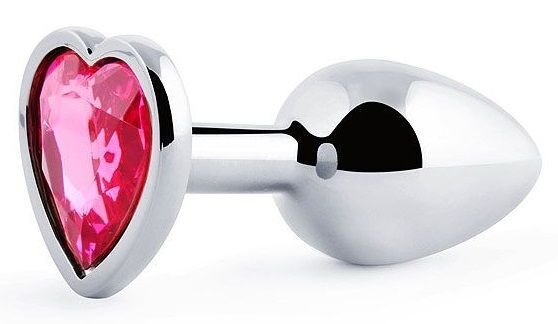 Серебристая анальная пробка с малиновым кристаллом-сердечком - 7 см.
