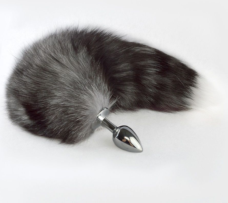 Серебристая анальная пробка с серым хвостиком