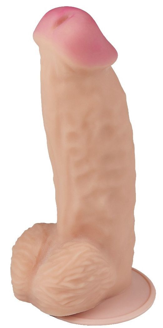 Телесный фаллоимитатор-супергигант с мошонкой на присоске - 34,5 см.