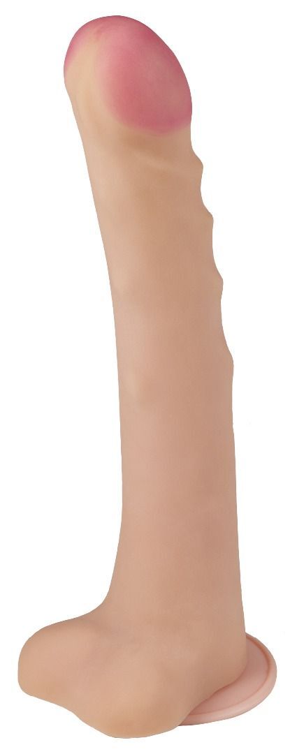 Телесный ребристый фаллоимитатор-супергигант с мошонкой на присоске - 39 см.