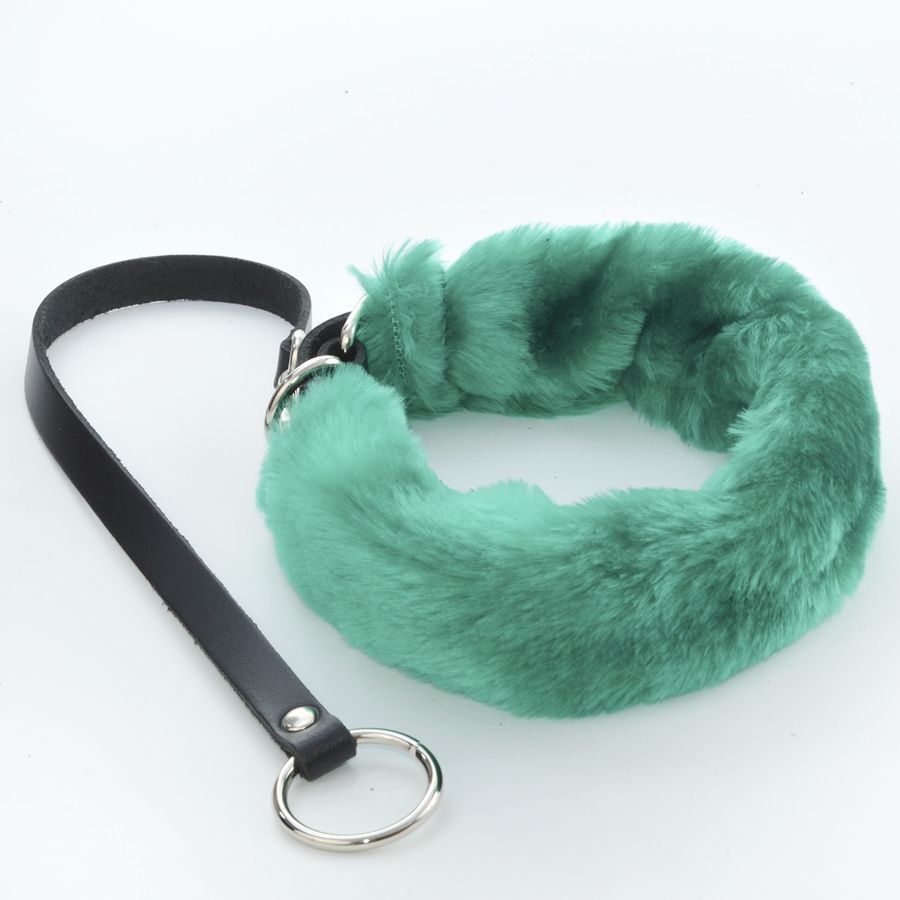 Зеленый меховой ошейник с кожаным поводком