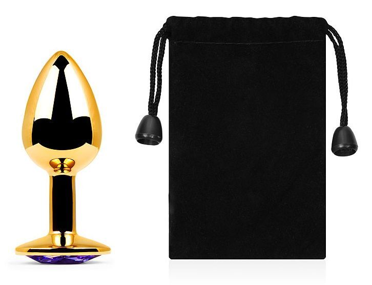 Золотистая анальная пробка с фиолетовым стразом - 7,2 см.